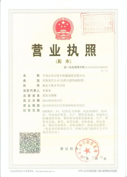 » 平顶山市百阳丰机械制造有限公司营业执照