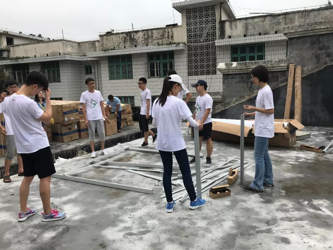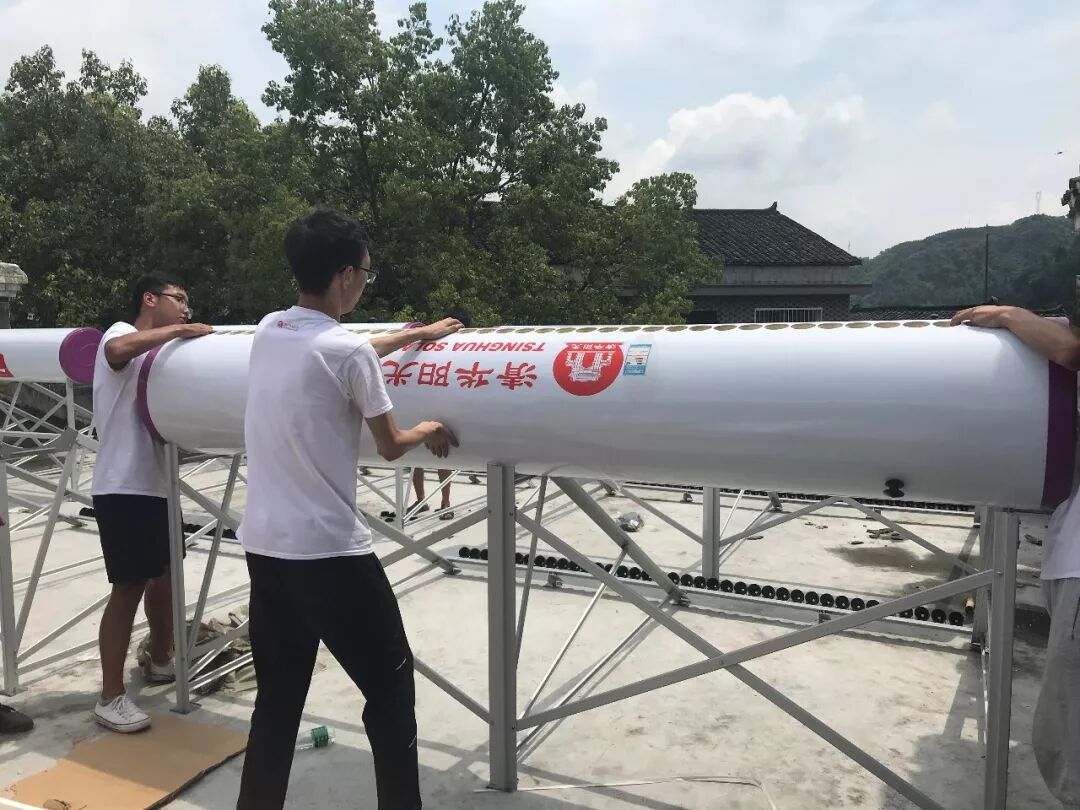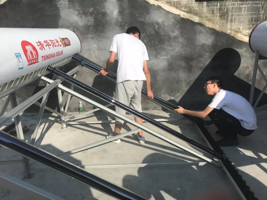 在工人师傅的指点下,大家开始了热火朝天的安装作业。当天气温十分炎热,太阳火辣辣的炙烤着大地,但没有人喊苦喊累,都挥洒着汗水不停忙碌着。从一台台支架的安装,到一个个螺母的拧紧,大家将自己的爱心及热情全部倾注进去 ,渴望用“清华阳光”太阳能热水器构筑起绿色、健康、环保的“阳光”校园!