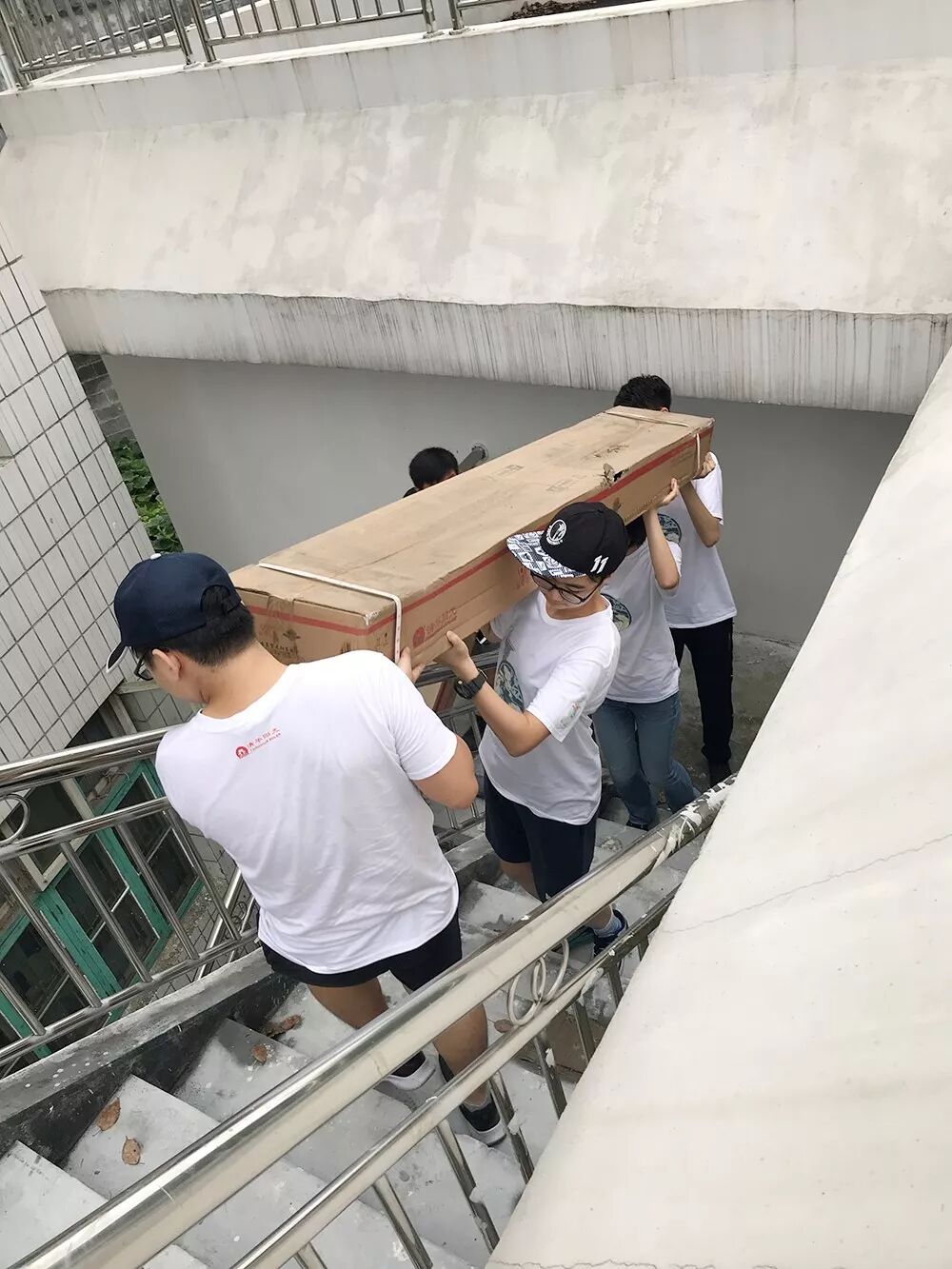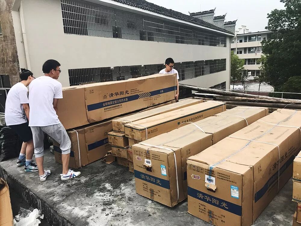 河溪镇中心小学安装条件较为艰苦,需要先将产品通过楼梯搬运到三层,再通过梯子运到顶楼。由于热水器体积大,重量沉,需要大家克服困难,共同协作努力完成。在整个过程中,不管男生女生,大家都撸胳膊挽袖子,不怕脏,不怕累,用较短的时间便将全部产品搬运到安装现场。