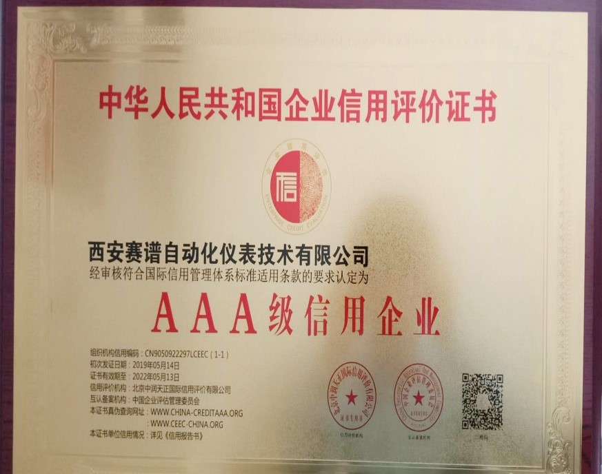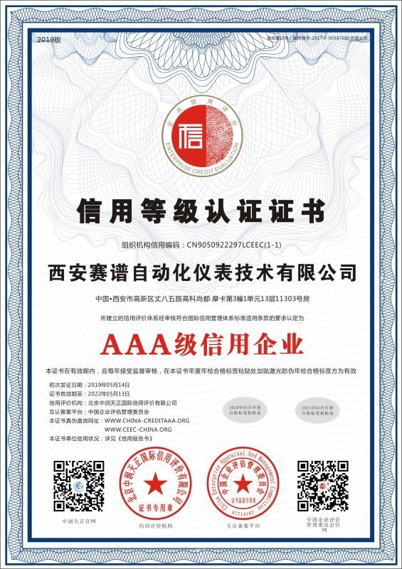AAA级信用等级证书表示该企业信用优良,资金实力雄厚,资产质量良好,经营管理水平高,经济效益明显,不确定因素对其经营与发展影响极小,履约能力强。获得企业信用等级AAA级证书,证明赛谱自仪在综合实力、合规自律、诚信经营、发展能力、社会责任等方面均获得权威机构的高度认可,这也是赛谱自仪品牌实力与品牌价值的重要体现。同时,获得AAA级信用等级证书在参与政府采购、招标投标、行政审批、市场准入、资质审核等活动中均能提供更有利的支持。