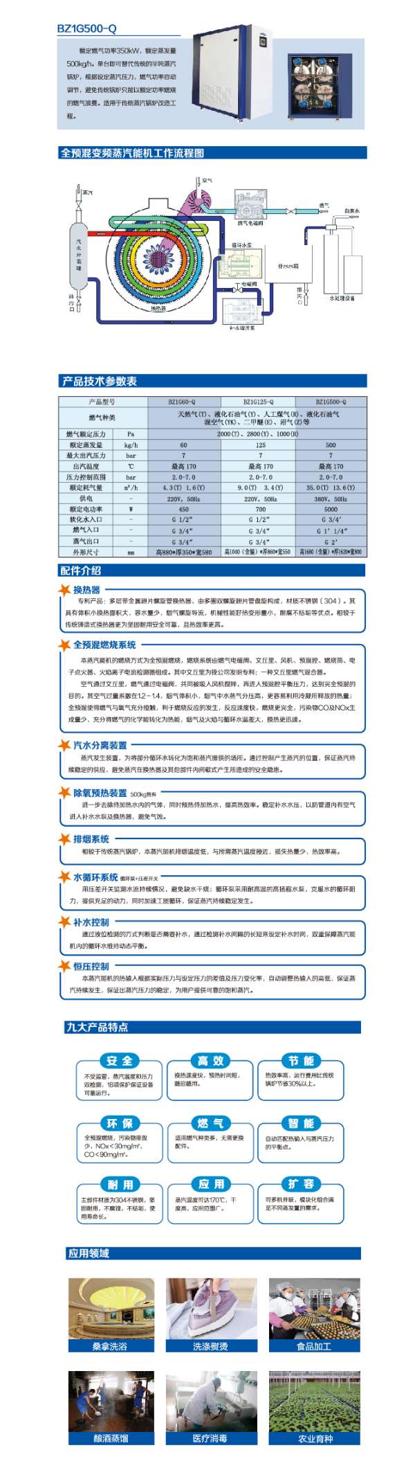 额定燃气功率350KW,额定蒸发量500kg/h。单台即可替代传统的半吨蒸汽锅炉,根据设定蒸汽压力,燃气功率自动调节,避免传统锅炉只能以额定功率燃烧的燃气浪费。适用于传统蒸汽锅炉改造工程。