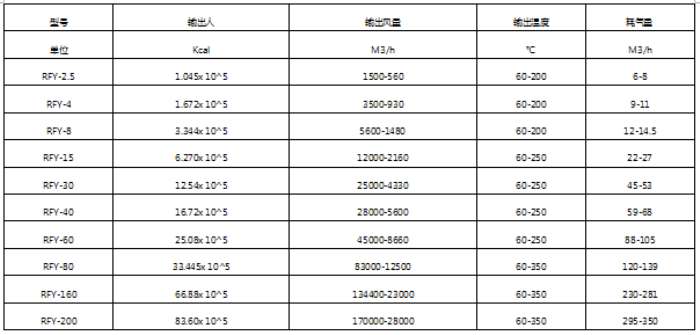 RF-Y(Q)系列燃油(气)热风炉的燃料通过燃烧器燃烧,产生高温燃气。并借助具有强化换热措施的热风炉将高温燃气的热量传导给被加热的空气,高温燃气经热量散发后温度降低至250度以下由引风机排放大气。需加热的空气通过选配的鼓风机强送入热风炉,吸热后温度升至额定值从热风出口送出,当热风温度达到额定的上限温度时,燃烧器会自动停止燃烧或自动转为小火焰燃烧;当热风温度降低到额定的下限温度时,燃烧器又会重新点燃运行或转为大火燃烧,升温的速度可调进风阀来实现。