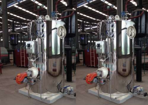LSS型燃甲醇(醇基燃料)蒸汽锅炉为立式快装内燃三回程火管锅炉。燃料由外界气源进入燃烧器通过自动调节、自动点火功能产生高温火焰,由炉胆顶部进入炉胆内的密排水管内侧,在炉胆下部向折180°进入炉胆与密排水管的夹层间,然后由炉胆下部烟道口折180°进入筒体与包装层之间的肋片层,烟气在肋片间传热后由上部烟道口离开锅炉到囱排入大气。锅炉配置技术性能良好燃烧器,采用了燃烧自动比例调节,给水自动调节,程序启停,全自动运行等先进技术,并具有高低水位报警和极低水位、超高汽压、熄火等自动保护功能。