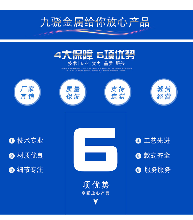 公司将“以人为本、精益求精、立志创新”为宗旨;拥有一批长期稳定的客户;利用自身“京津冀三角洲”的优势,信息渠道广,能将各种客商需求的产品信息反馈,提高了订单的几率。河北九骁金属制品有限公司的诚信、实力和产品质量获得业界的认可。欢迎各界朋友莅临参观、指导和业务洽谈。